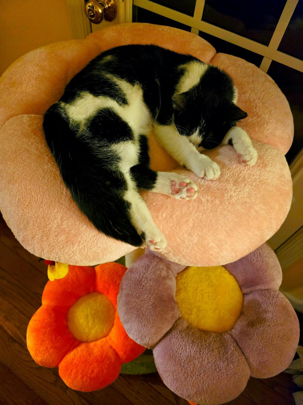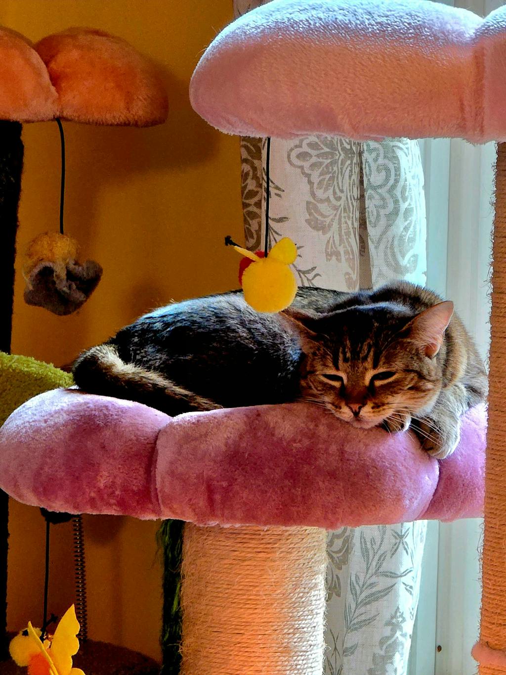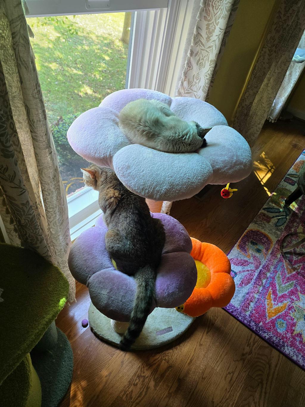 middle platform of Four Leaf Clover Cat Tree shaped like a smiling sunflower, made of soft material