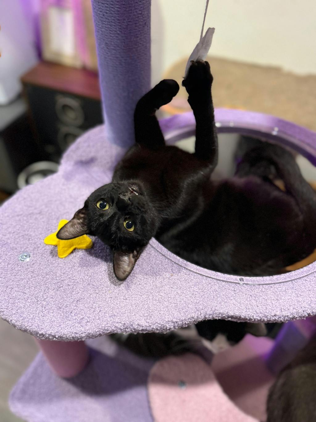 We recommend this cat tree for cats weighing up to 12 pounds.